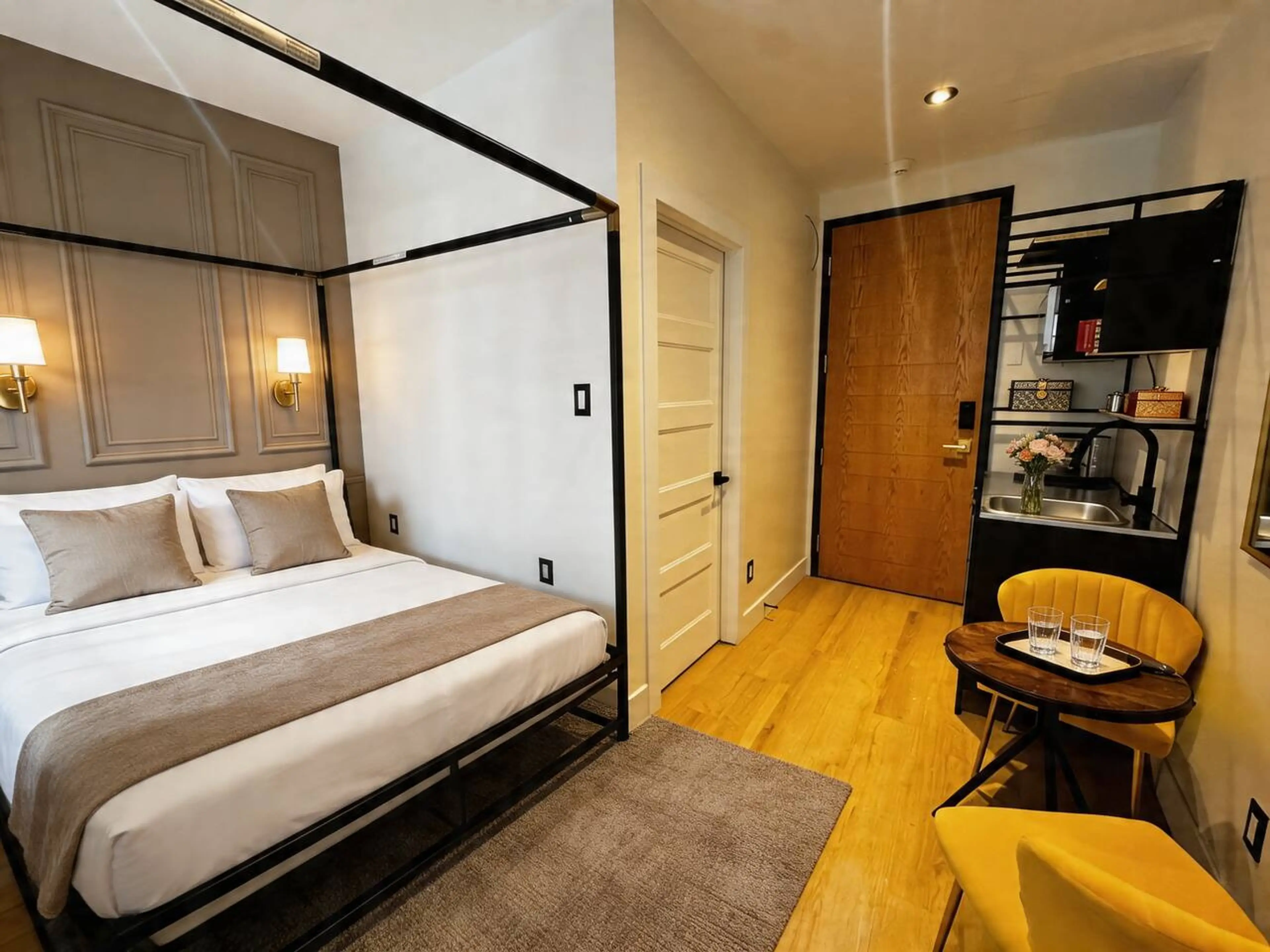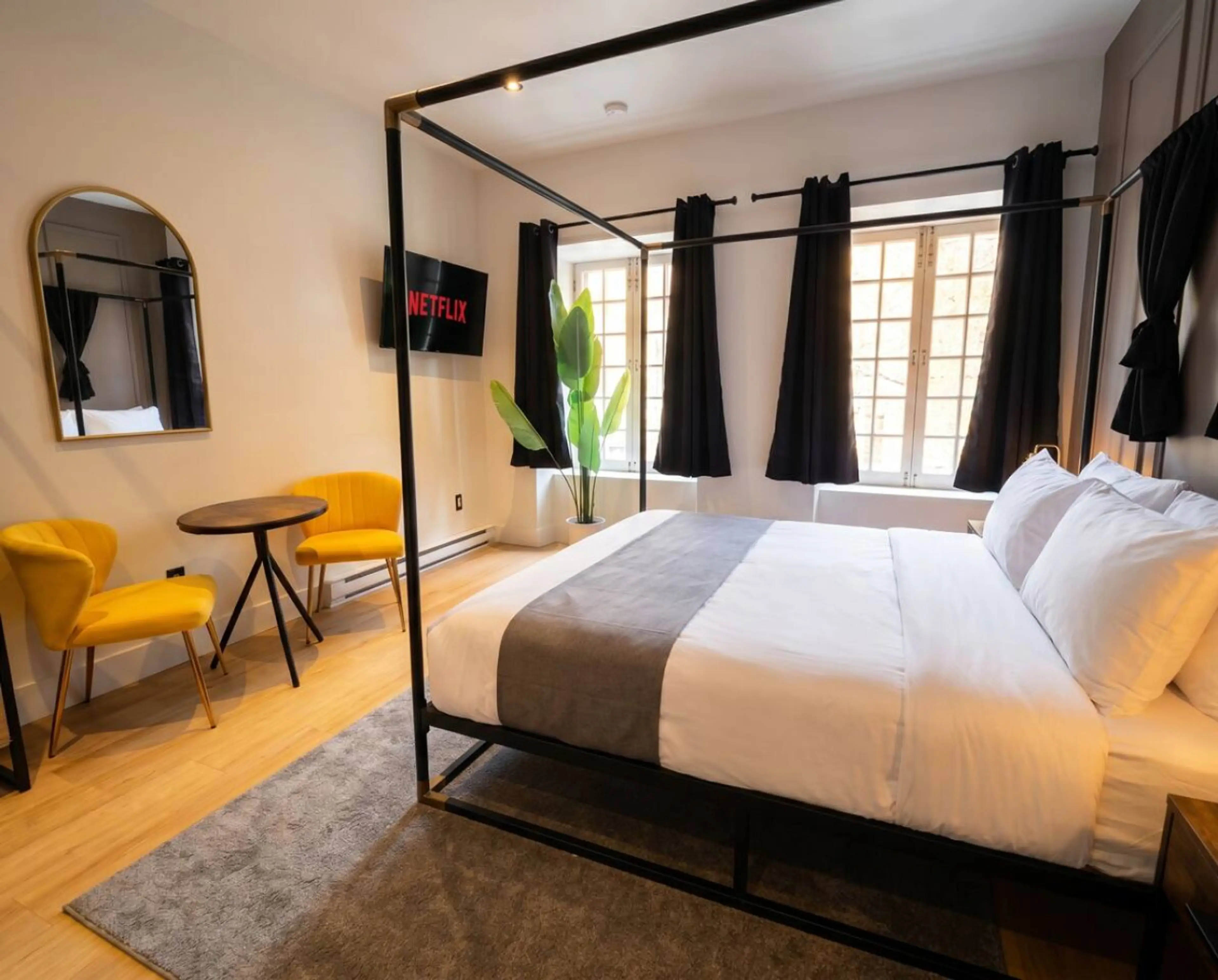 Step into a world where 19th-century stone meets modern boutique design. This meticulously designed suite in the heart of Old Montréal offers the intimacy of a private retreat with the amenities of a boutique hotel. Your suite features a dramatic four-poster queen bed dressed in white linens, hardw...